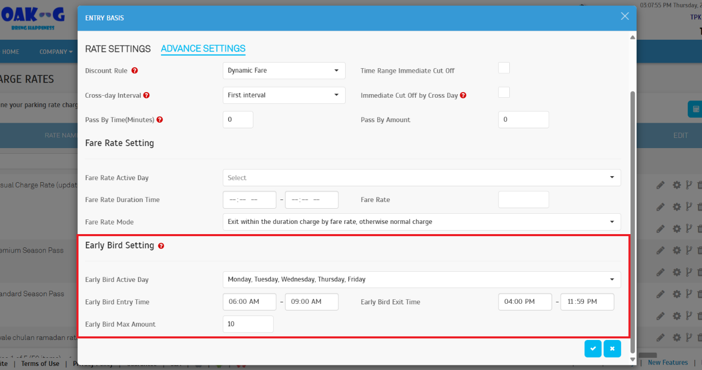 a. A new section titled "Fare Rate Mode" has been added under Advanced Settings. This section allows operators to configure specialized fare structures based on entry or exit timing conditions, offering greater flexibility in how parking charges are calculated.