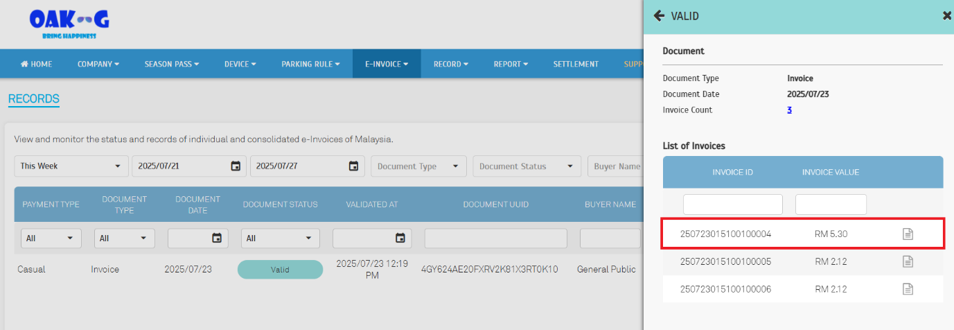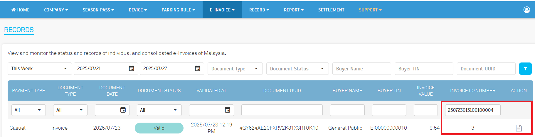 i. Navigate to E-Invoice > Record and search using the "Invoice ID / Number" column.