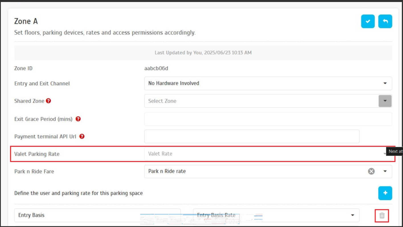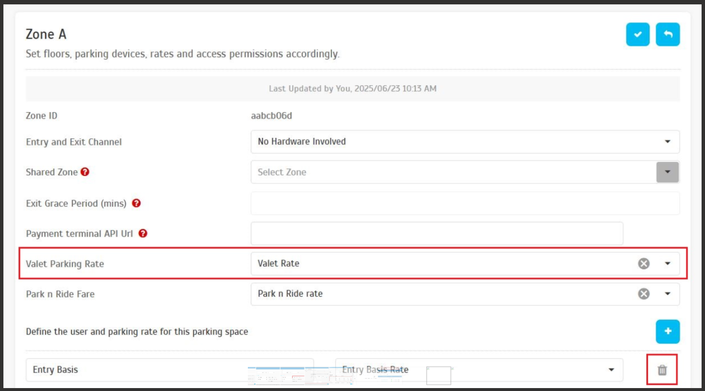 This applies to both Entry Basis and Valet charge rates. If deletion is attempted while in use, the system blocks the action with a clear error message.